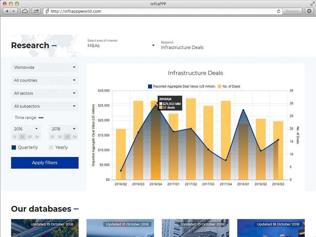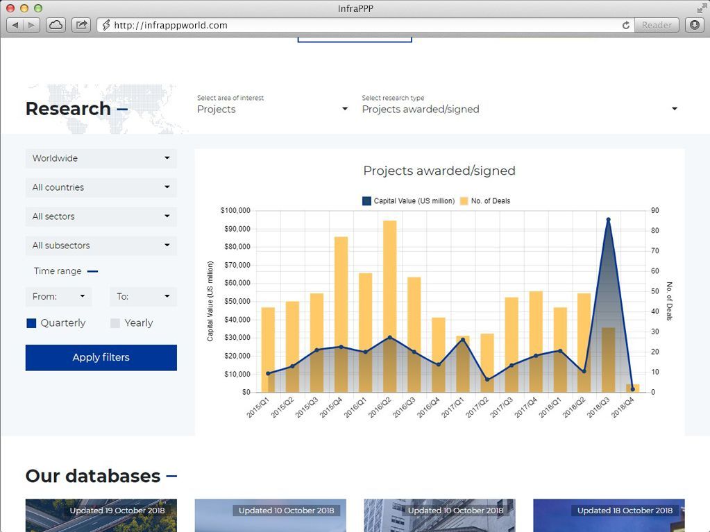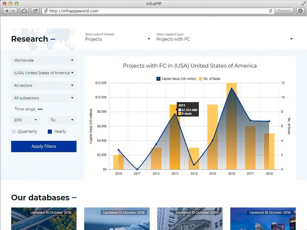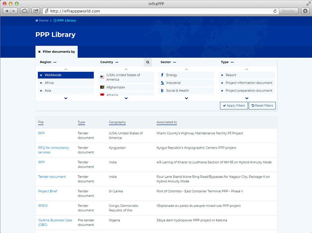 We offer a variety of plans and services to help you navigate the infrastructure PPP market, including download of data for specific countries or project interest. We also offer customized solutions. If you are interested in our services but do not see a plan that meets your requirements, please Contact Us.
