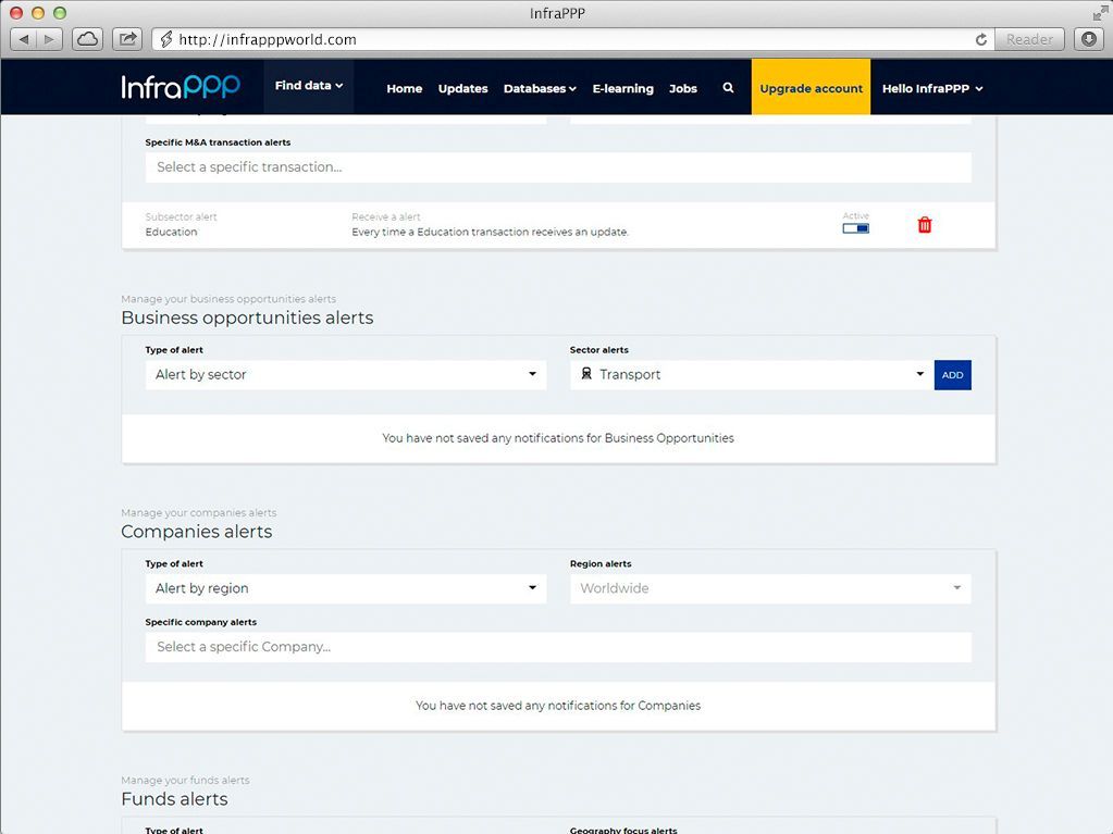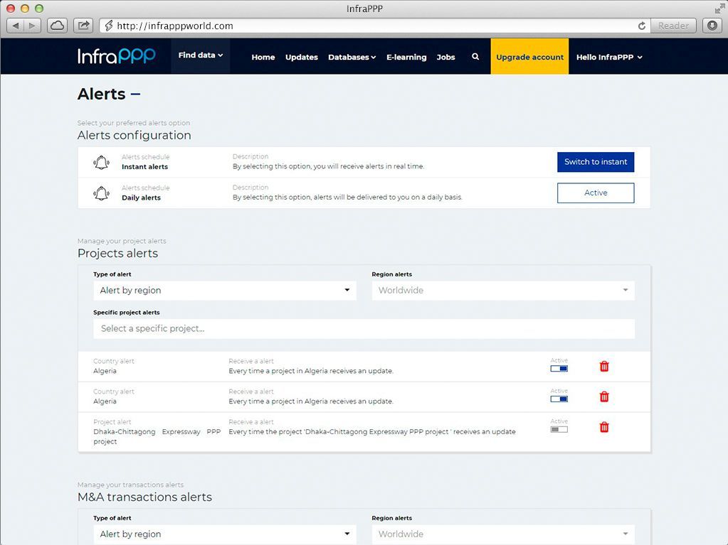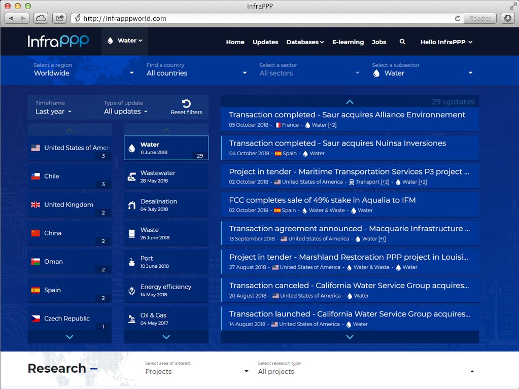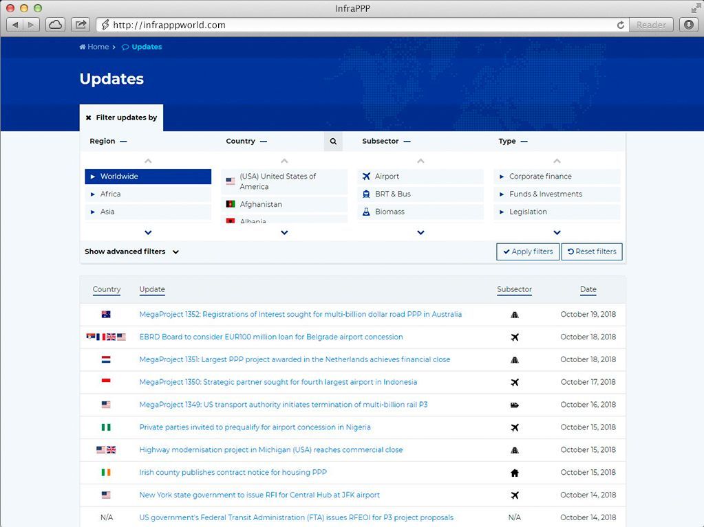 We offer a variety of plans and services to help you navigate the infrastructure PPP market, including download of data for specific countries or project interest. We also offer customized solutions. If you are interested in our services but do not see a plan that meets your requirements, please Contact Us.
